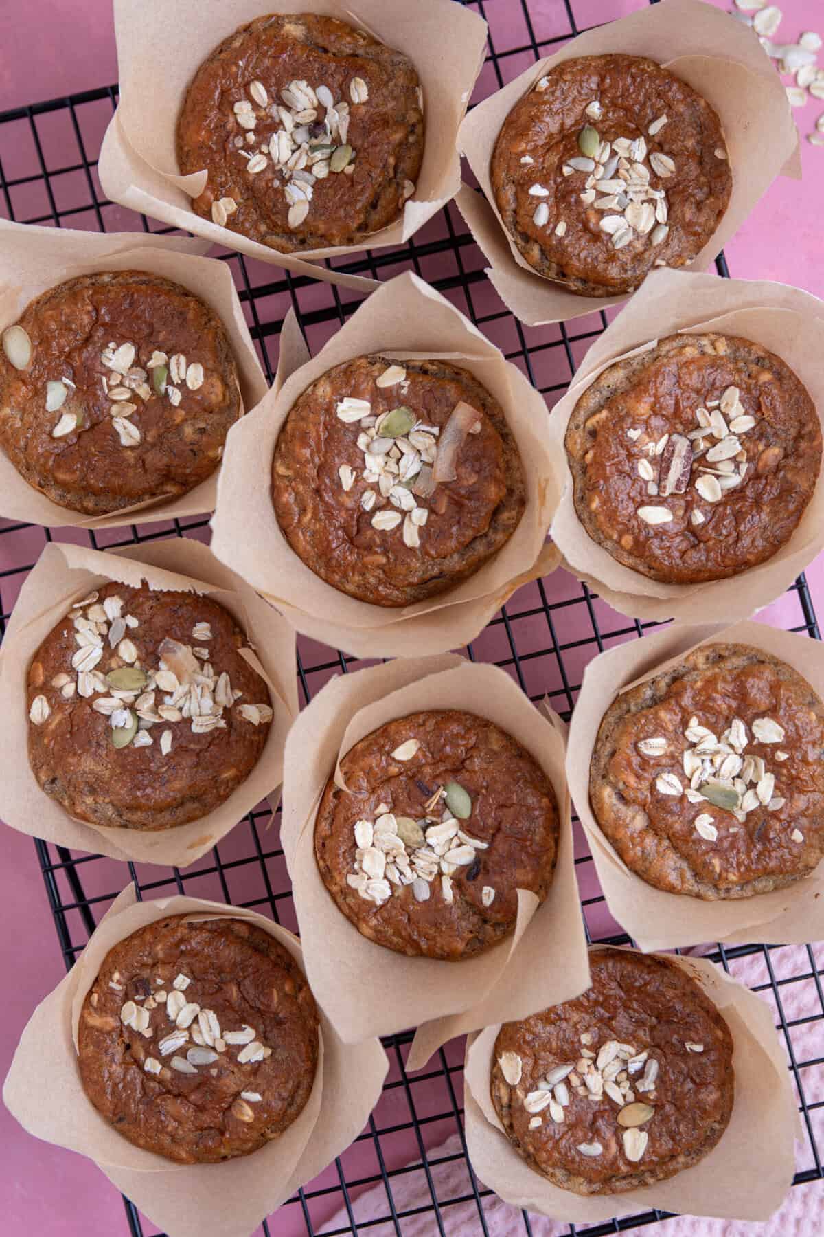 Lovely. Lovely wholemeal oat nutritious muffins. I leave my bananas chunky and added sunflower and pumpkin seeds for a crunch.