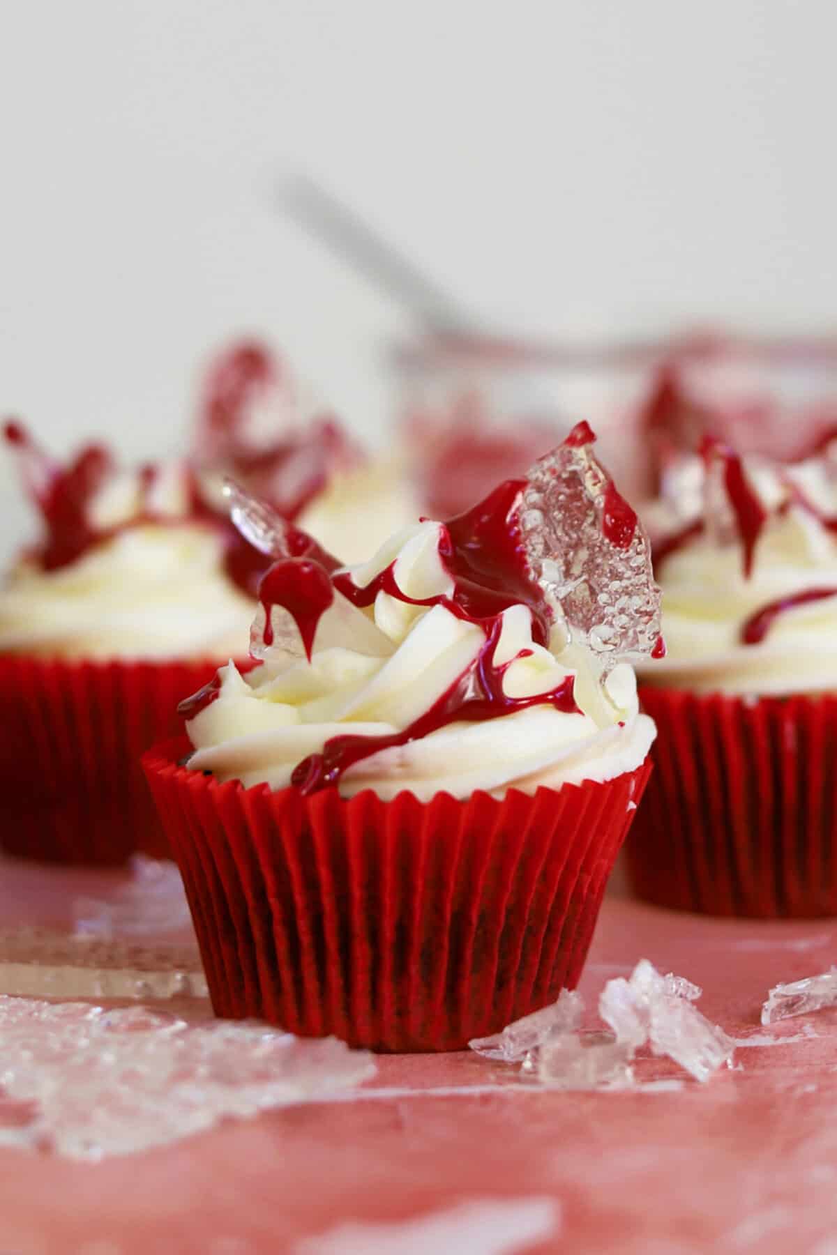 - Why choose this recipe? These Broken Glass Cupcakes are the perfect Halloween bake if you want something that looks a bit gory. The glass shards on top of the red velvet cupcakes are made from melted sweets and the fake blood is a white chocolate ganache.