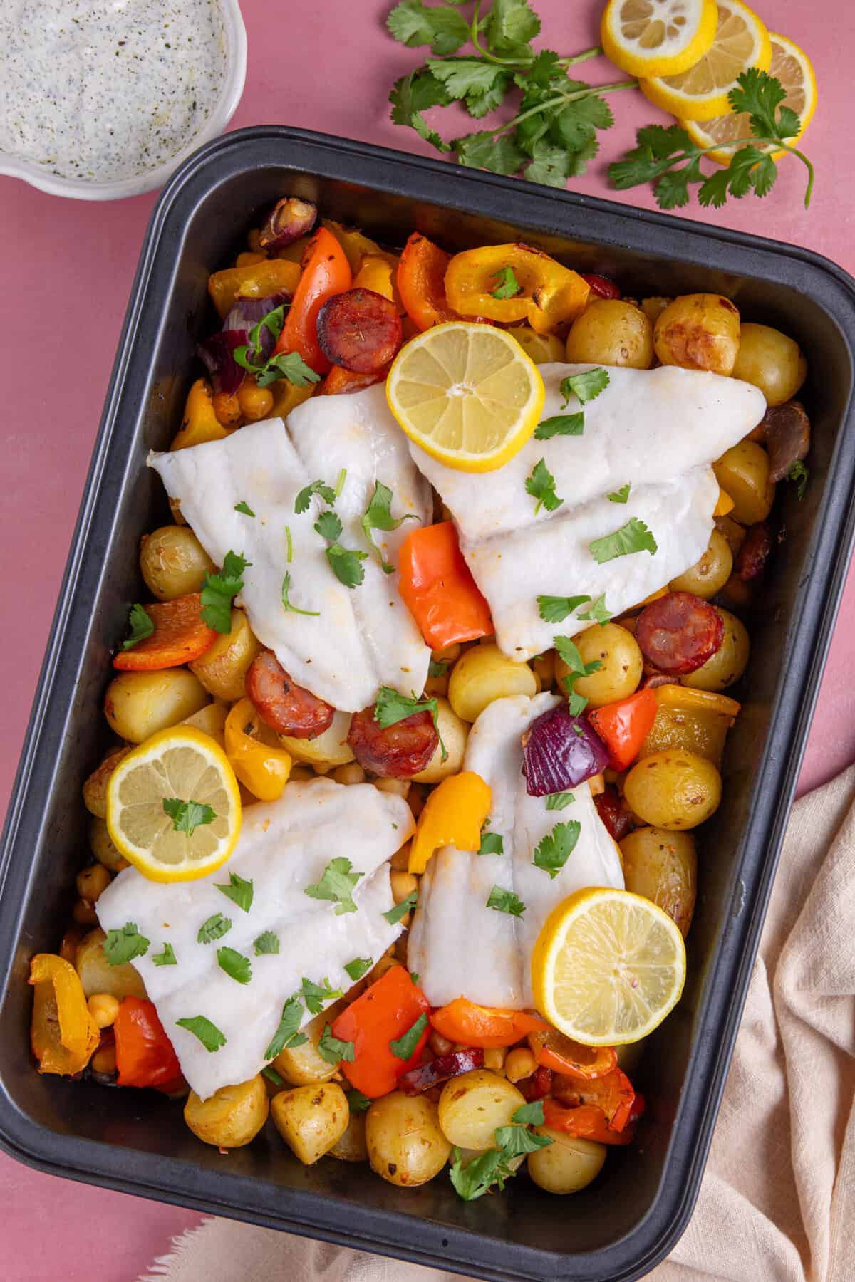 This Cod and Chorizo Traybake is the perfect answer when you want a one pan dinner which is light and full of flavour. Flaky cod fillets, spicy chorizo, baby potatoes and mixed veg cooked in a Mediterranean marinade, served with garlic yoghurt drizzle.