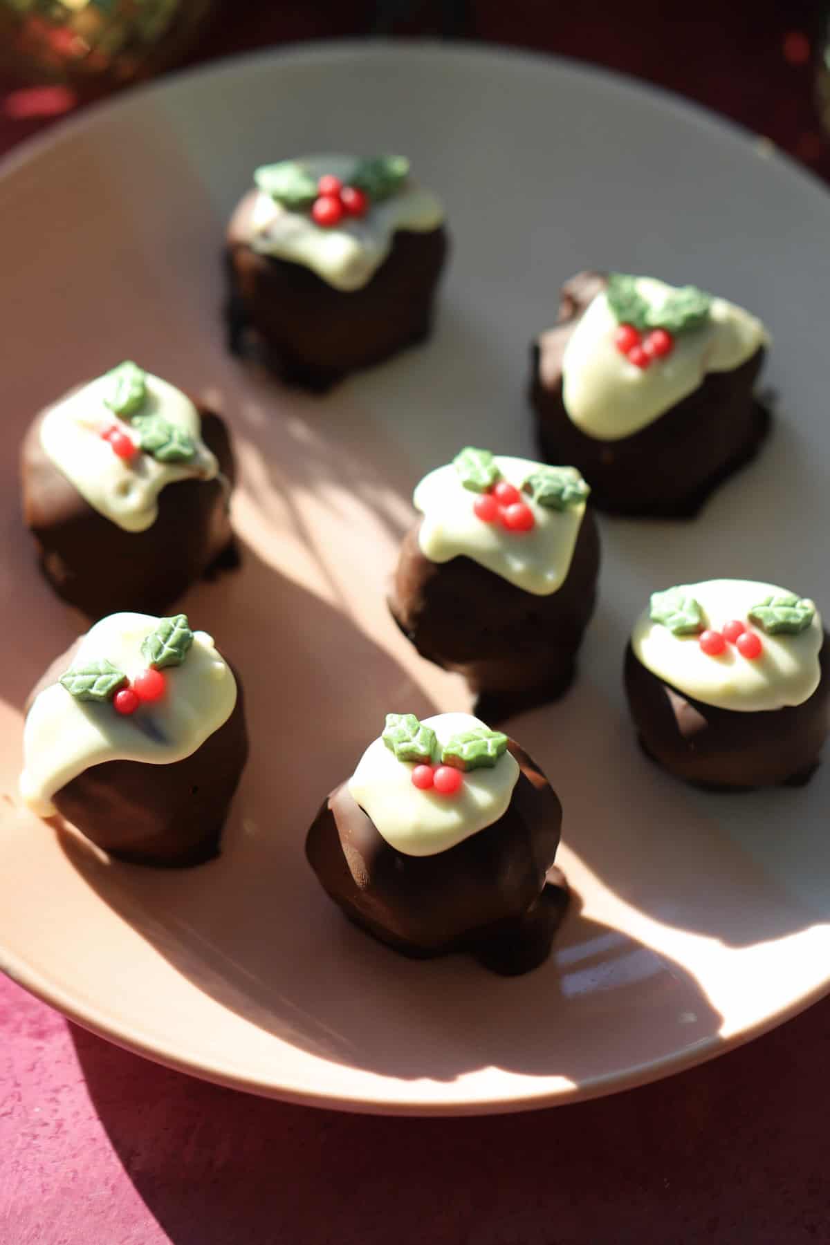 - Melt the white chocolate in a bowl over hot water. Use a teaspoon to drizzle a tiny amount on top of each Christmas pudding, then carefully arrange the holly sprinkles on top. Set in the fridge before tucking in!