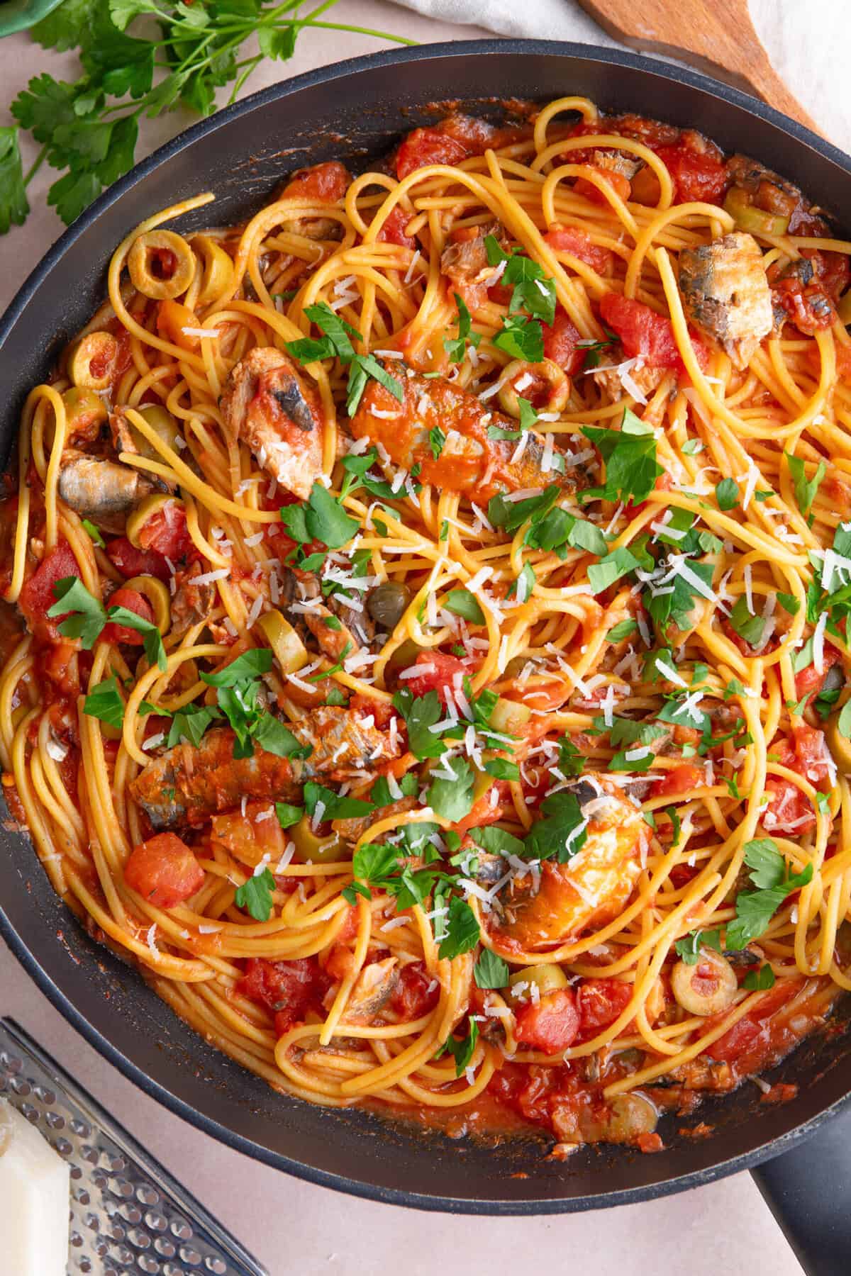 Add the sardines in tomato sauce to the pan as well as the tinned tomatoes, capers and olives. Mix well, breaking up the flesh of the fish a bit, and simmer until the pasta is cooked.